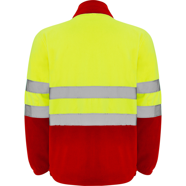 Jachetă din polar de vizibilitate ridicată. · Fermoar central cu protecție pentru bărbie. · Două benzi reflectorizante orizontale la piept și pe mâneci. · Două buzunare frontale cu fermoar de aceeași culoare și un buzunar la piept. · Manșete elastice și talie cu opritori reglabili în interior.