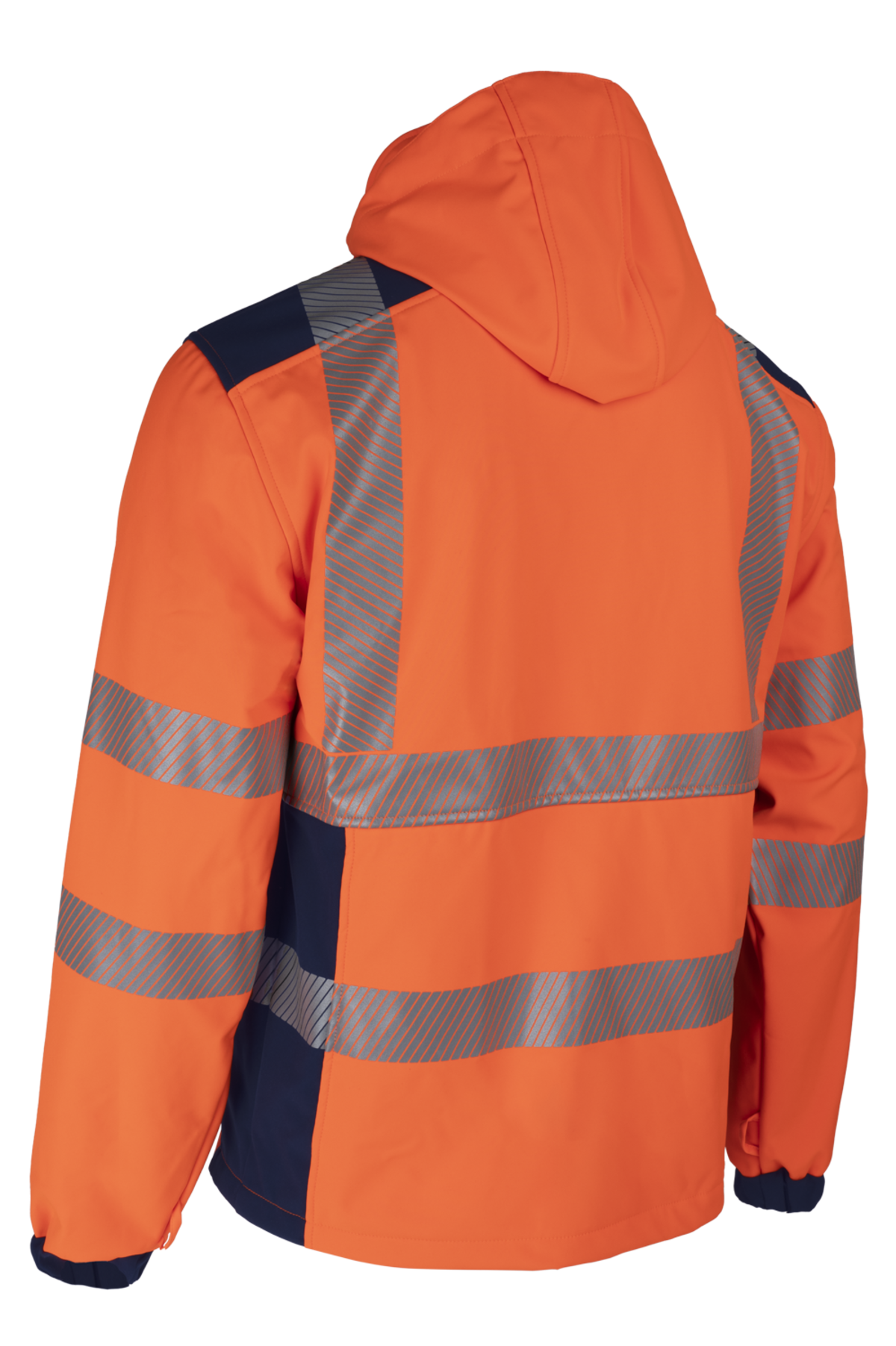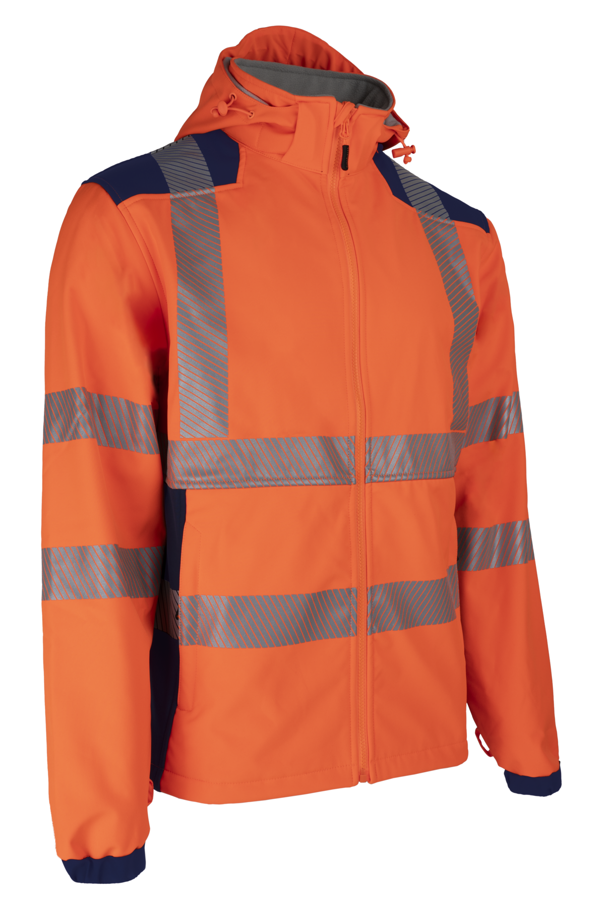 Jachetă softshell reciclată galben HV/bleumarin, 3 straturi: 100% poliester reciclat cu stretch mecanic + membrană TPU reciclată + microfleece reciclat – 295g/m². Glugă detașabilă, guler înalt cu protecție pentru bărbie, inserții contrastante: umeri, laterale și brațe. Fermoar central la piept, 2 fermoare sub manșetă, benzi segmentate elastice reflectorizante.